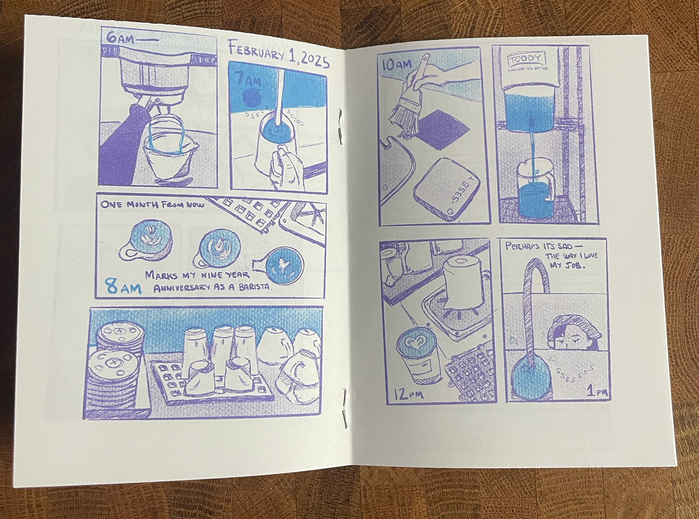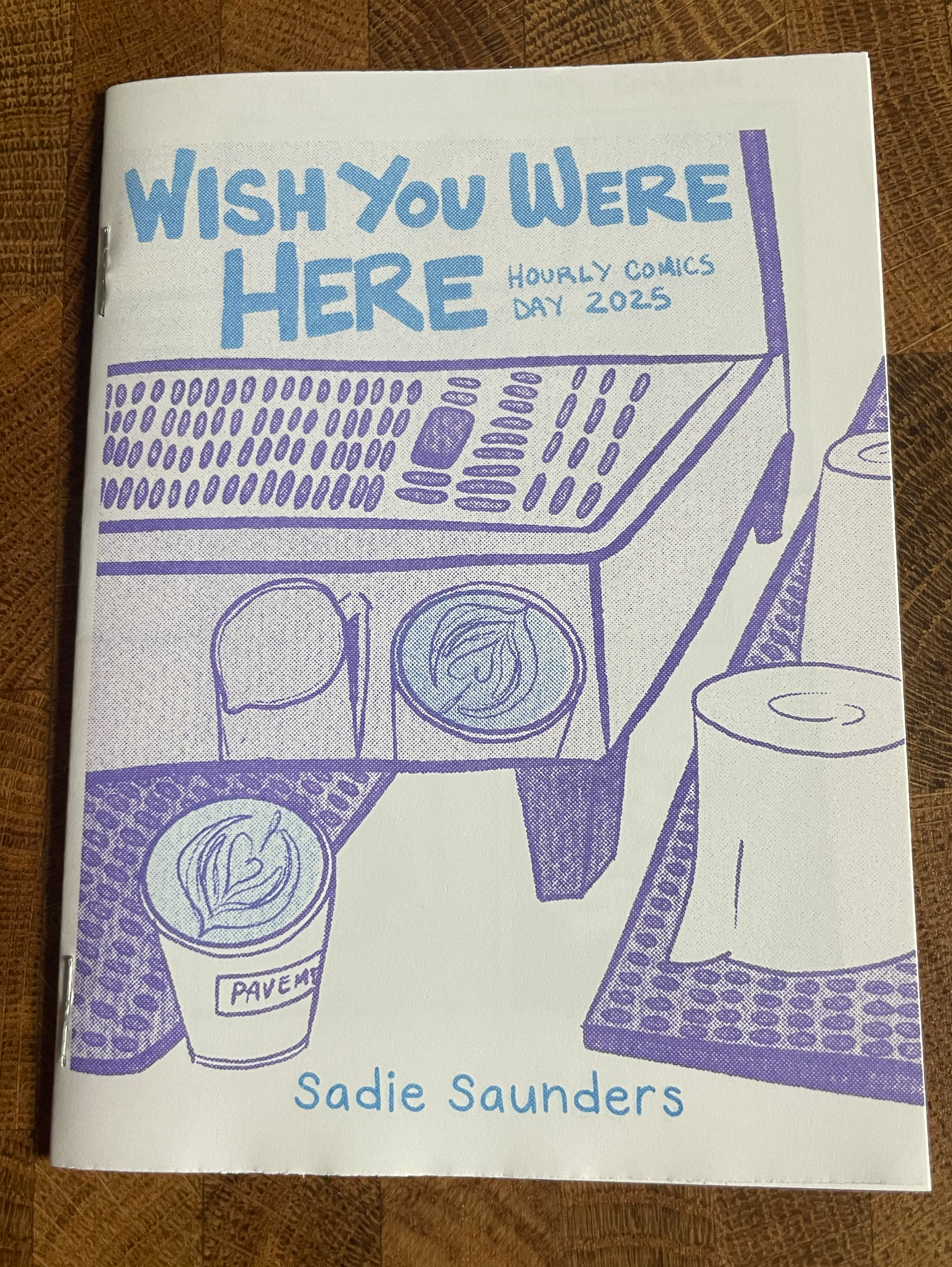 Made for Hourly Comics Day 2025, Wish You Were Here ruminates on working a dead end job, processing a breakup, and public speaking events, and one very, very long day. All images were drawn in a single day, with touch-ups added later on.